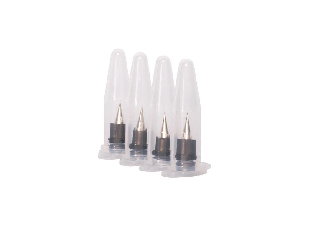 Dostupné sú kovové presné trysky pre maximálne rozlíšenie tlače (typicky 100, 150 a 225 µm) aj jednorazové plastové trysky určené pre jednoduchšie dávkovanie a rýchlu výmenu. Kovové trysky umožňujú dosiahnuť jemné a detailné PCB návrhy, zatiaľ čo jednorazové verzie minimalizujú zanášanie a zjednodušujú údržbu systému.