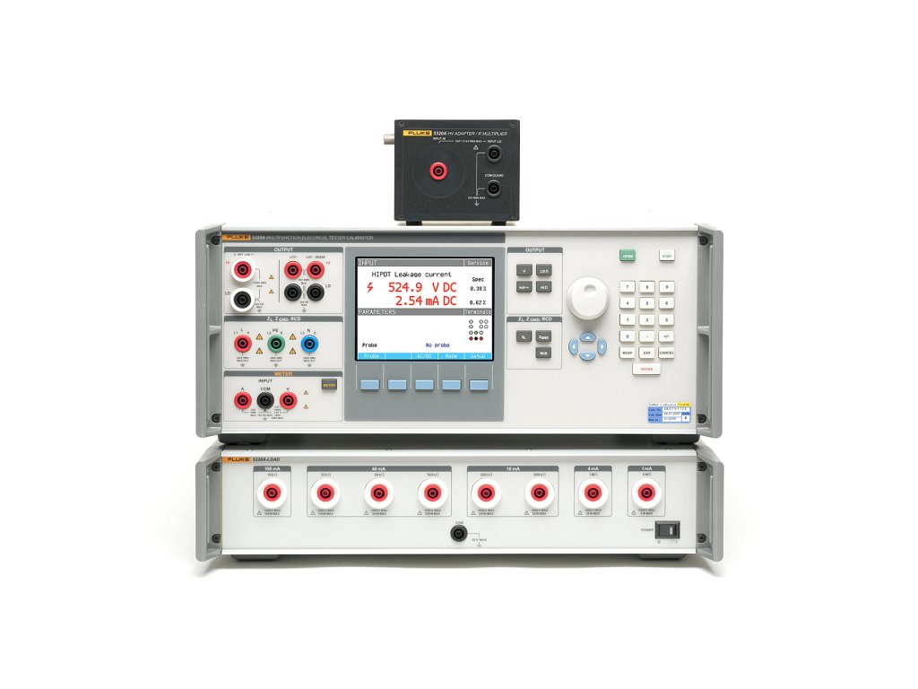 Electrical safety testing with hipots is an integral part of development and manufacturing of electronic and electrical products, ranging from refrigerators to power supplies to test equipment to cables. Such testing is often required by government regulations to ensure product safety. The Fluke 5320A provides best-in- class hipot calibration of ac and dc voltage. The built-in 1000 V meter measures voltage and current. For voltages over 1 kV, Fluke offers two accessory items: a 10 kV adapter or 40 kV probe. With the 10 kV adapter, ac voltages to 10 kV can be calibrated with 0.5 % accuracy. Either item can be used with the built-in meter to measure voltage or flash voltage over 1000 V.