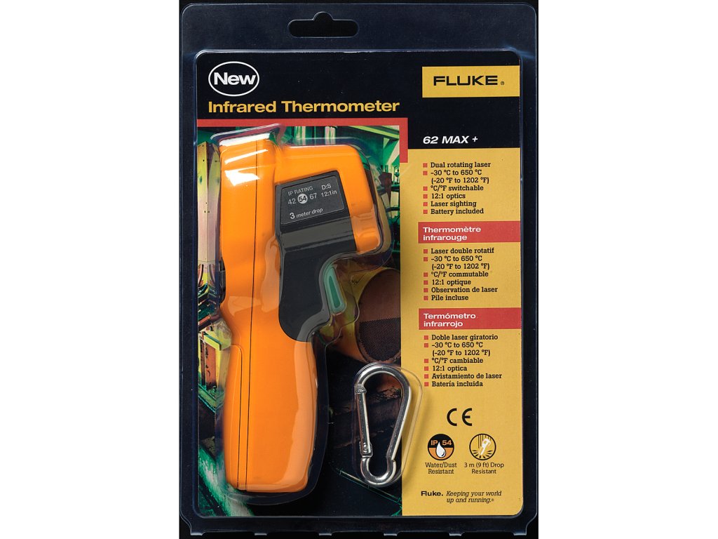 Fluke 62 MAX+ je vylepšený model s rozšíreným rozsahom merania do 650 °C a vyššou presnosťou ±1,0 °C. Ponúka optický pomer 12:1 a je vybavený dvojitým laserom, ktorý presnejšie označuje meranú oblasť. Obe verzie sú odolné voči prachu a vode podľa IP54, pracujú s jednou AA batériou a sú navrhnuté na spoľahlivú prevádzku v náročných podmienkach.