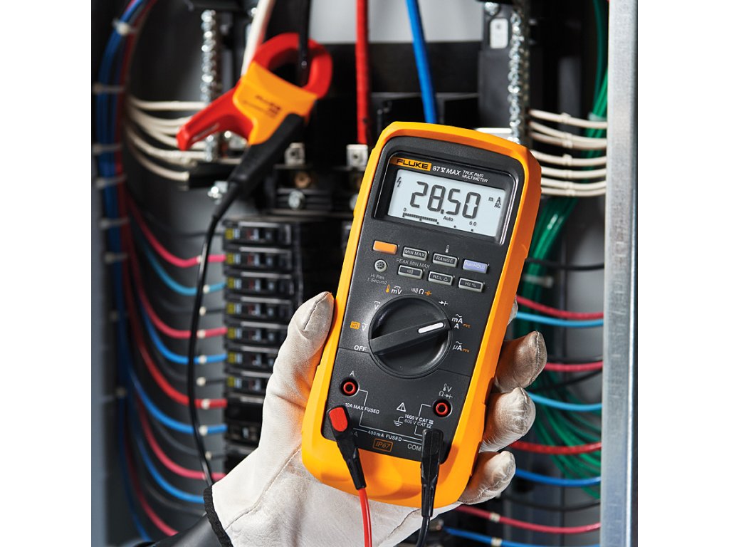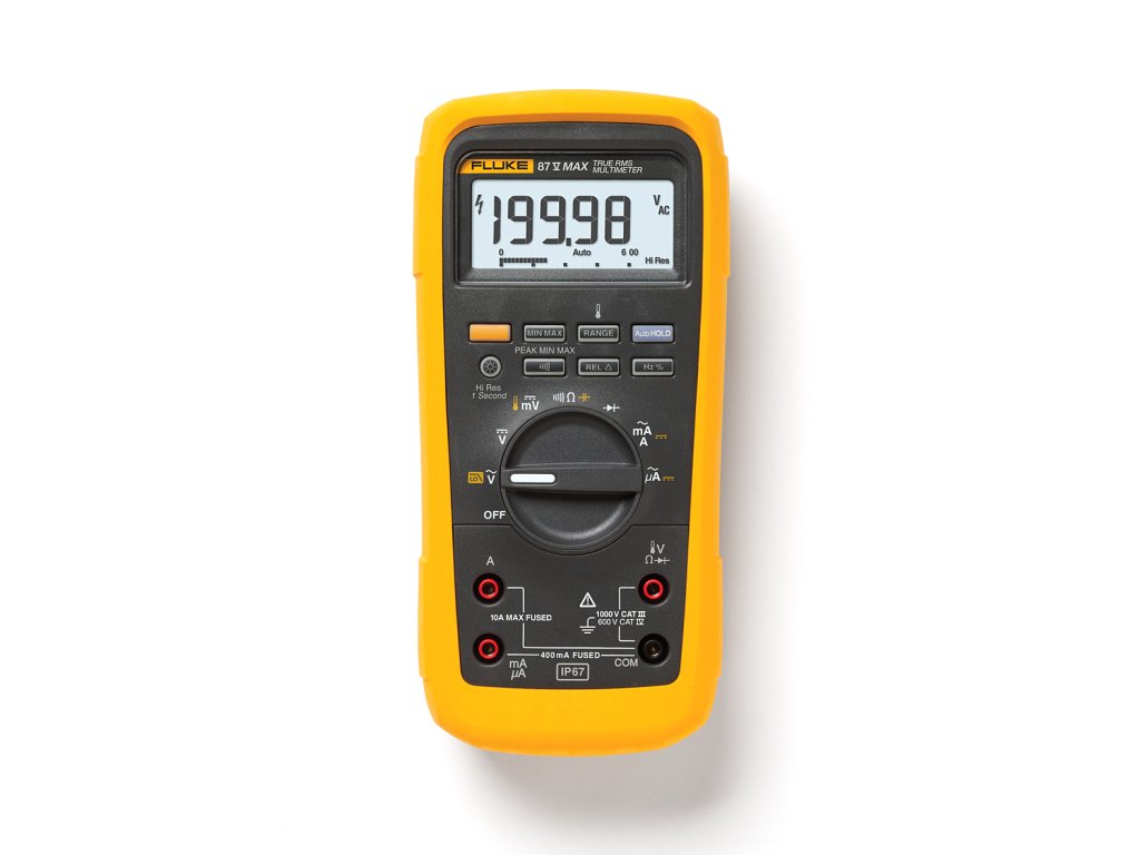 Najodolnejší multimeter z dielne Fluke. Model 87V Max je postavený z tých najľahších, no zároveň najodolnejších materiálov. Na odolnosti prístroja má veľký podiel práve klasické, žlté púzdro, ktoré okrem iného slúži aj ako držiak šnúr pre tých ktorí radi pri práci používajú ina jednu ruku.