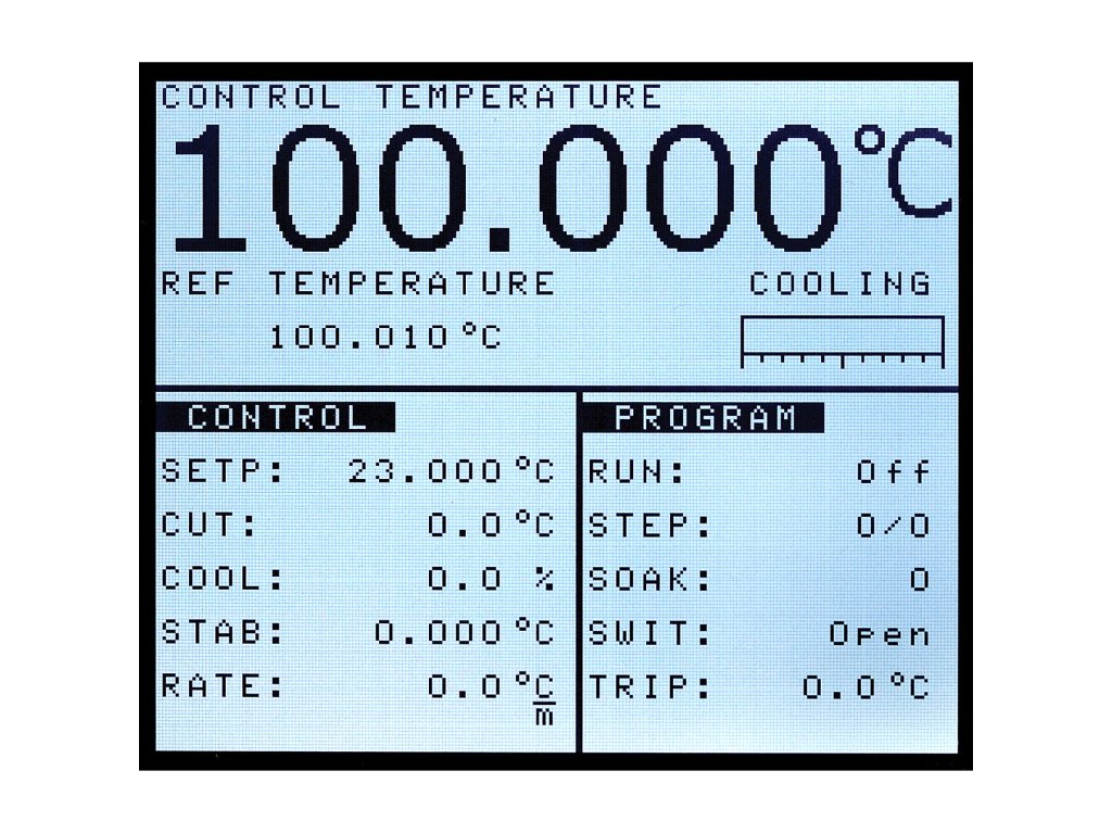 A large LCD display, numeric keypad, and on-screen menus make use of Metrology Wells simple and intuitive. The display shows the block temperature, built-in reference thermometer temperature, cutout temperature, stability criteria, and ramp rate. The user interface can be configured to display in English, French, or Chinese.
