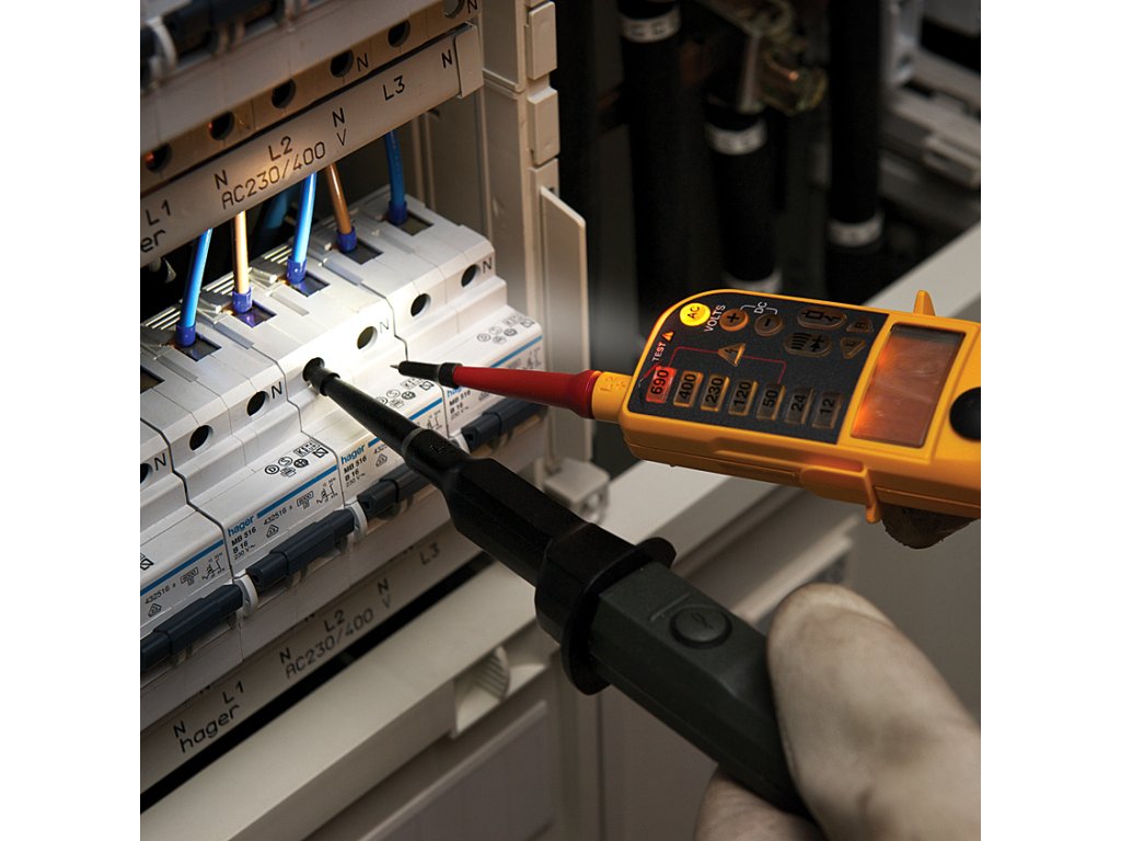 Vadaska Fluke T150/VDE je ideálny nástroj pre profesionálov, ktorí potrebujú spoľahlivé a presné merania elektrických parametrov. Tento tester umožňuje meranie napätia až do 690 V AC/DC, meranie odporu do 1999 Ω a kontinuity do 400 kΩ. Vybavený je podsvieteným displejom, LED indikátormi a akustickým signálom pre jednoduché čítanie výsledkov v rôznych podmienkach. Funkcia display hold umožňuje uchovanie nameraných hodnôt na displeji pre pohodlné prezeranie.