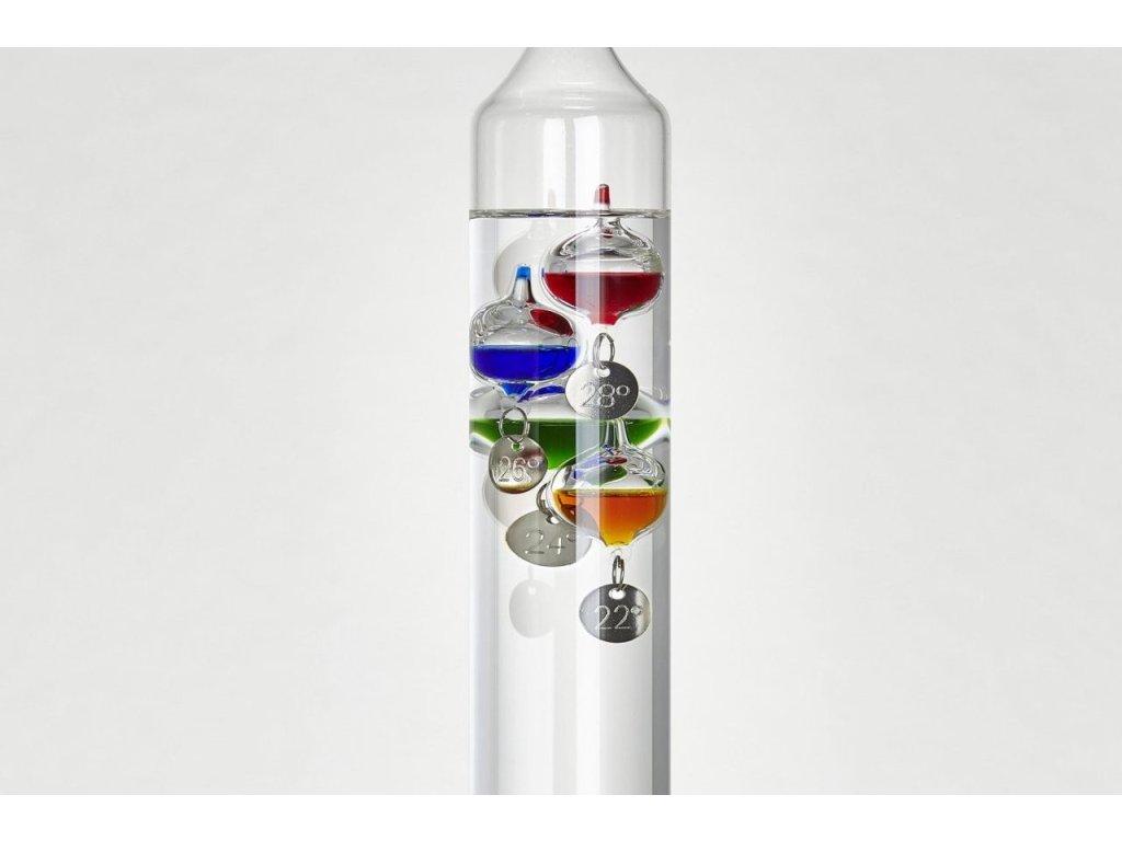 Galileov teplomer - výška 43,5 cm. Sklený teplomer s gulôčkami.