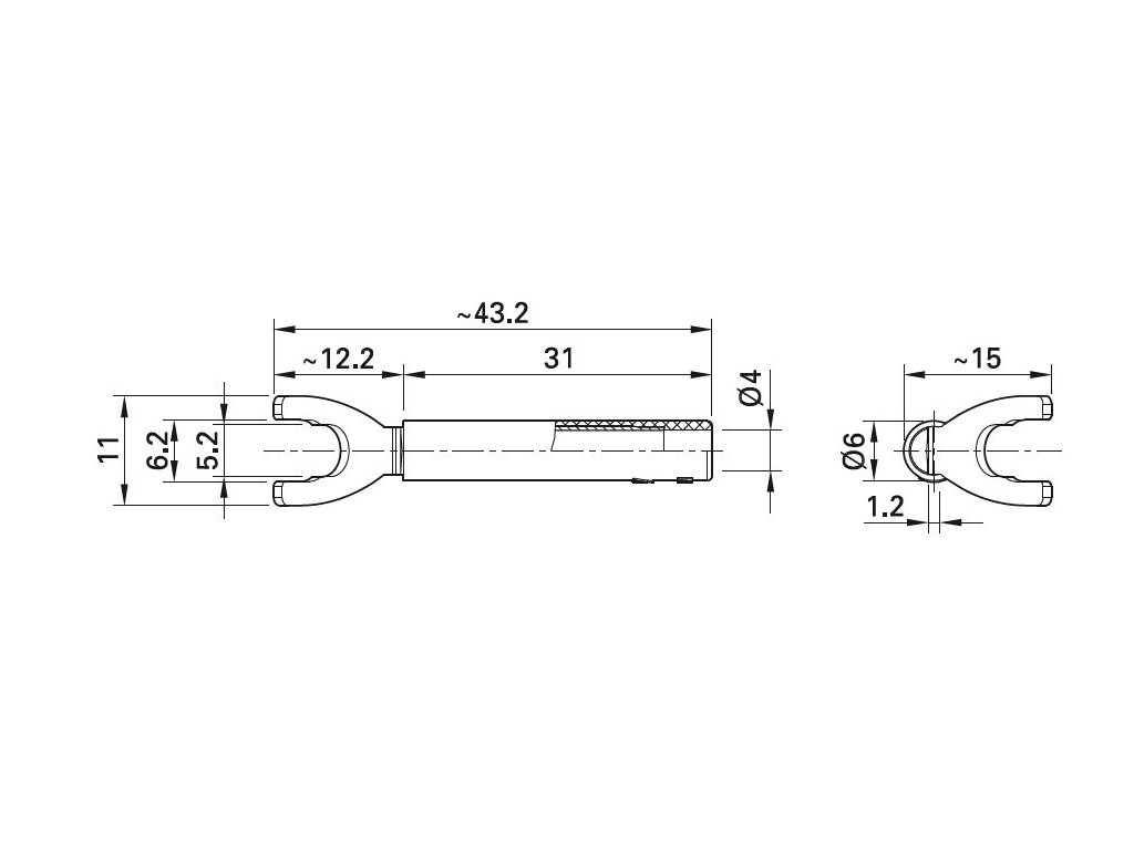Made of brass for permanent installation, e.g. for connecting screw terminals. Ø 4 mm rigid socket in insulator accepting spring-loaded Ø 4 mm plugs with rigid insulating sleeve. Fork lug bent to an angle of 45°.
