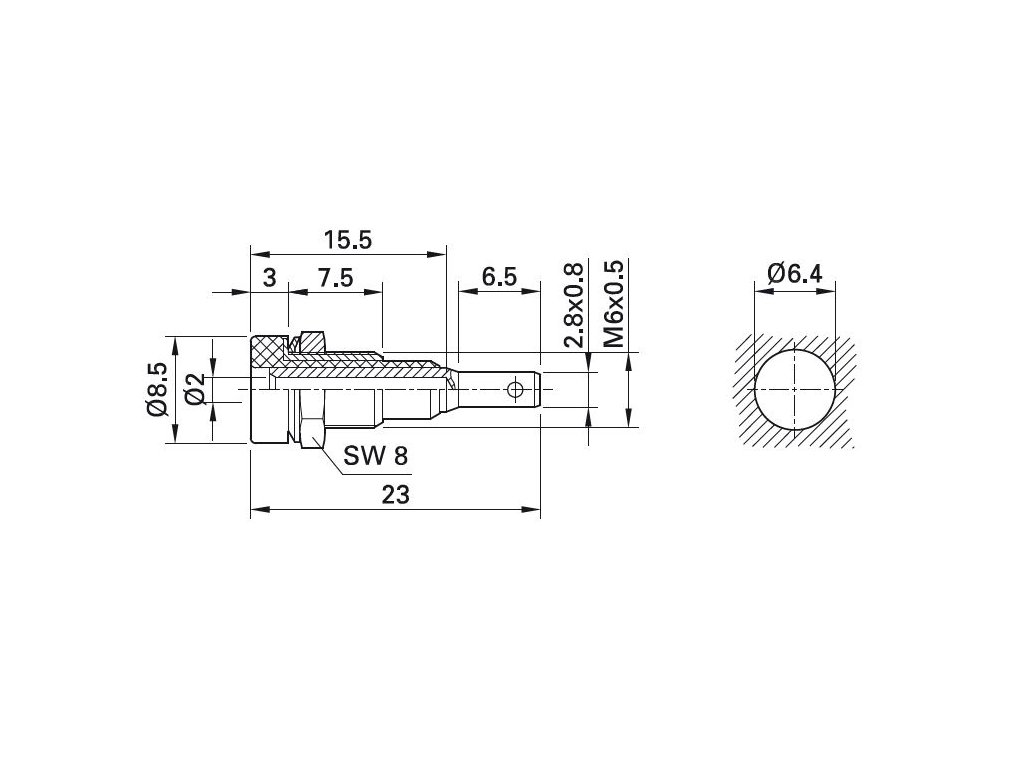 Insulated Ø 2 mm rigid. Machined brass. Metal thread jacket on the insulation. The socket can be screw-mounted in predrilled panels. Flat connecting tab 2.8 mm x 0.8 mm.