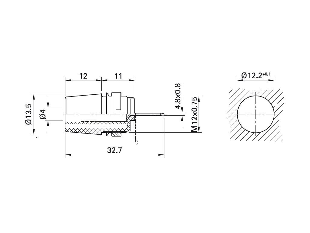 Insulated, rigid, Ø 4 mm, accepting spring-loaded Ø 4 mm plugs with rigid insulating sleeve. Brass sheet. The socket is surface- mounted in pre-drilled panels of plastic, metal, etc. Flat connecting tab 4.8 mm x 0.8 mm, can be bent to 90°, once only.