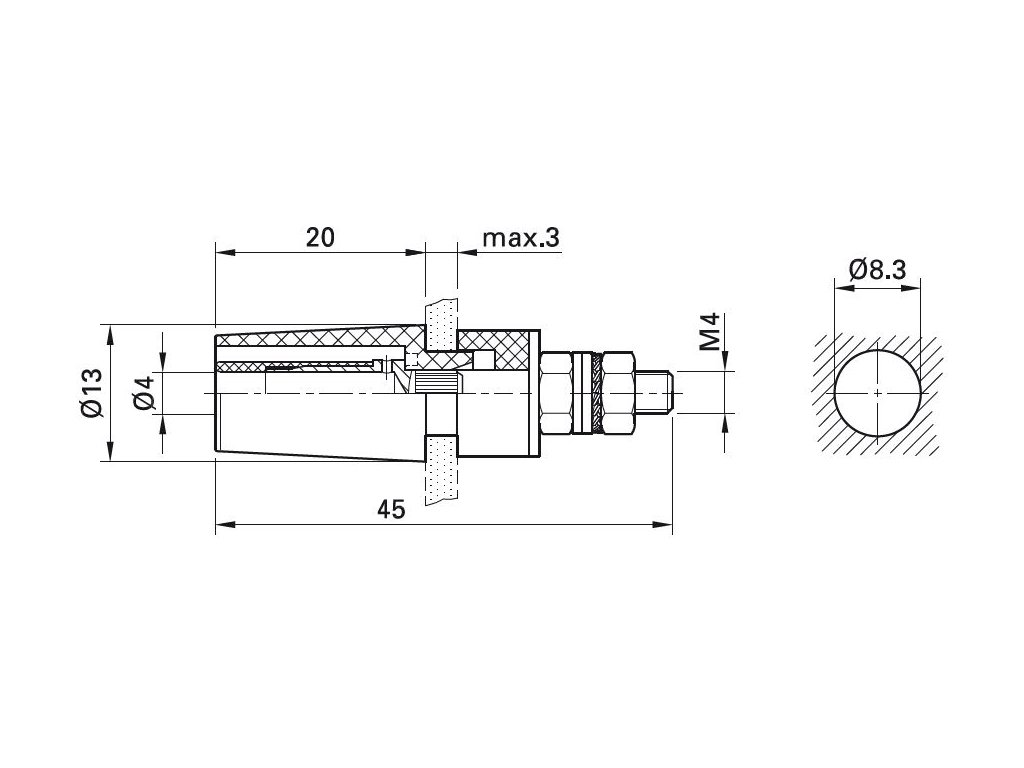 Insulated, rigid, Ø 4 mm, accepting spring-loaded Ø 4 mm plugs with rigid insulating sleeve. Machined brass. The socket is surface-mounted in pre-drilled panels of plastic, metal, etc. Connection: Threaded bolt M4.