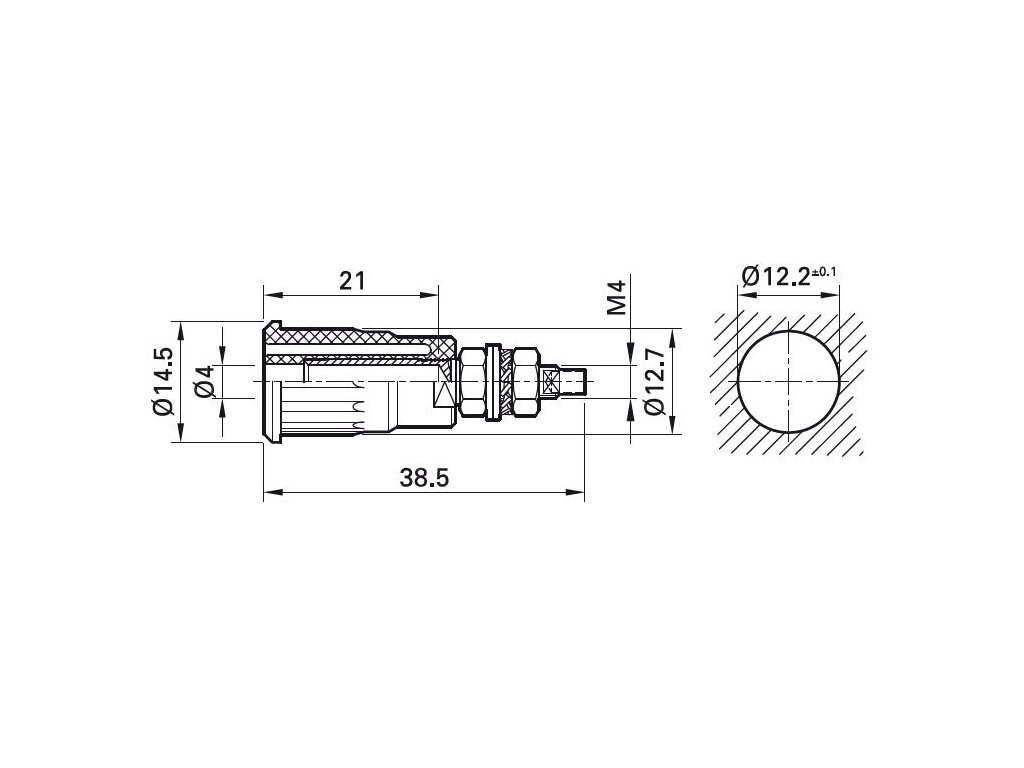 Insulated, rigid, Ø 4 mm, accepting spring-loaded Ø 4 mm plugs with rigid insulating sleeve. Machined brass. The socket is pressed into pre-drilled panels of plastic, metal, etc. Connection: Various.