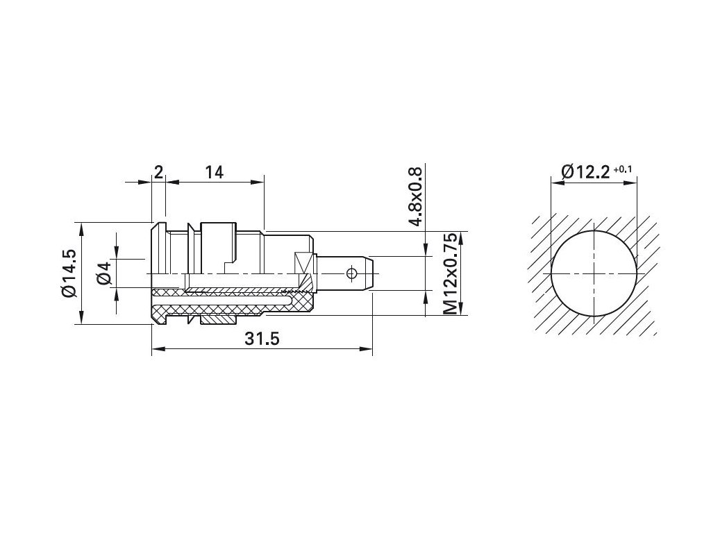 Insulated, rigid, Ø 4 mm, accepting spring-loaded Ø 4 mm plugs with rigid insulating sleeve. Machined brass. The socket is screwed into pre-drilled panels of plastic, metal, etc. Connection: Flat connecting tab.