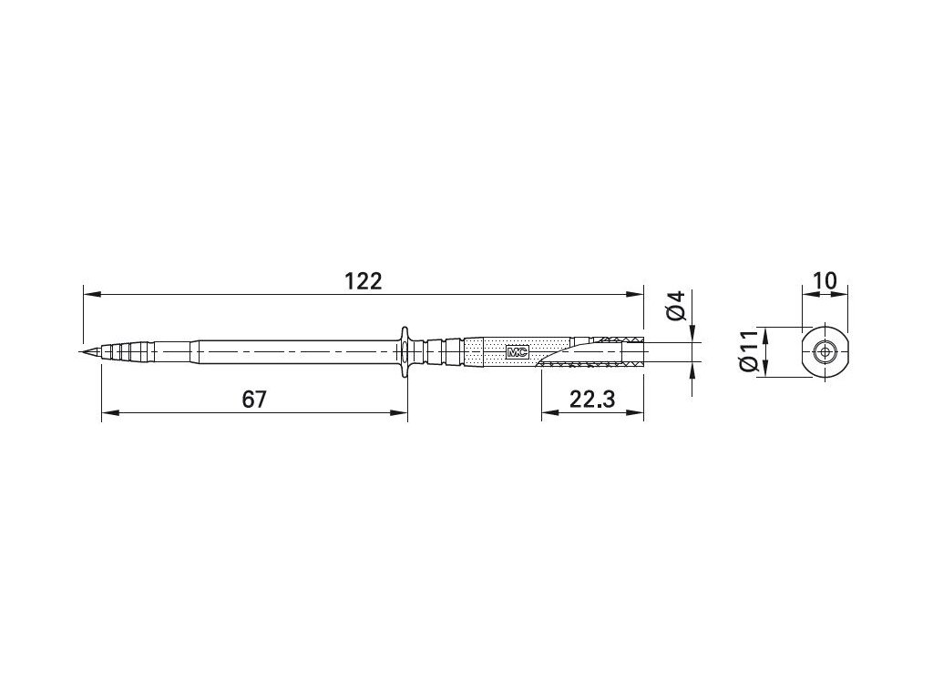 Test probe with tapered, stainless steel rigid needle and with handle guard chamfered on both sides. Ø 4 mm rigid socket in handle accepting spring-loaded Ø 4 mm plugs with rigid insulating sleeve. Supplied with protective cap.