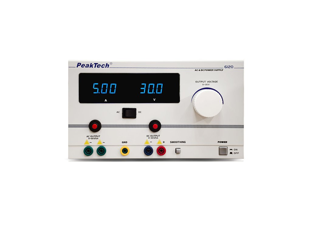 PeakTech P 6120 je laboratórny zdroj napájania, ktorý poskytuje nastaviteľné jednosmerné (DC) aj striedavé (AC) napätie v rozsahu od 0 do 30 V s maximálnym prúdom 5 A. Je ideálny pre výskum, vývoj, technické vzdelávanie a údržbu elektrických obvodov.