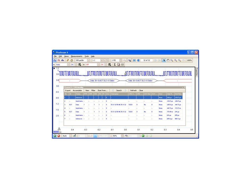 - sériové dekódovanie – dekóduje dáta zo sériových zberníc, napriklad CAN bus