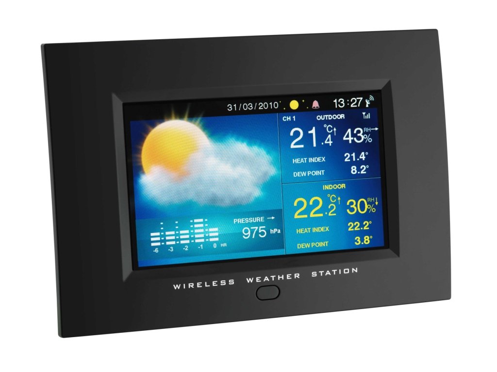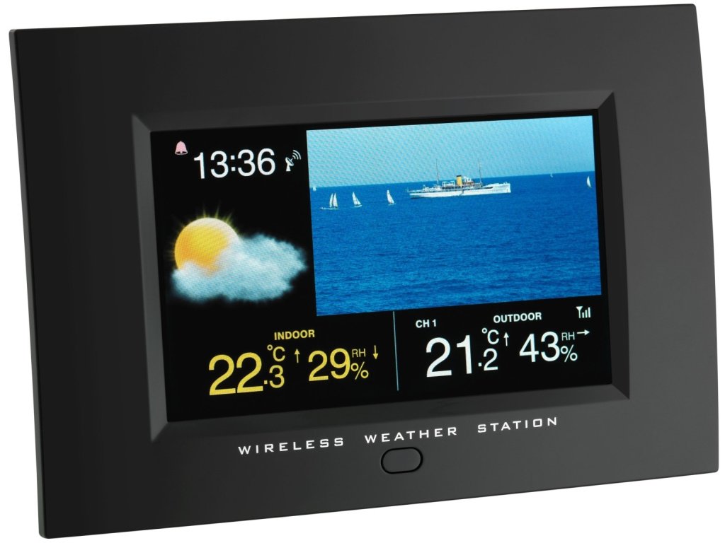 Luxusná meteostanica, fotorámik a barometer. Zobrazuje predpoveď počasia, vývoj tlaku vzduchu, teplotu, vlhkosť, rosný bod, pocitovú teplotu, kalendár. Zobrazuje fotografie ako fotorámček alebo spoločne fotografiu a informáciu o počasí. Umožnuje pripojiť 3 externé snímače.